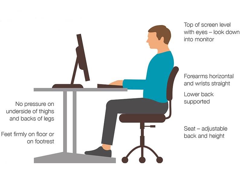 Sit upright with your shoulders relaxed, maintaining contact between your back and the chair.